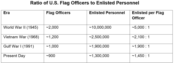 As both force size and readiness have deteriorated, the rank of senior leaders has expanded. The ratio of flag officers (generals and admirals) to enlisted personnel has more than tripled since World War II. This growth indicates increased bureaucratization and an aversion to risk rather than genuine operational need.