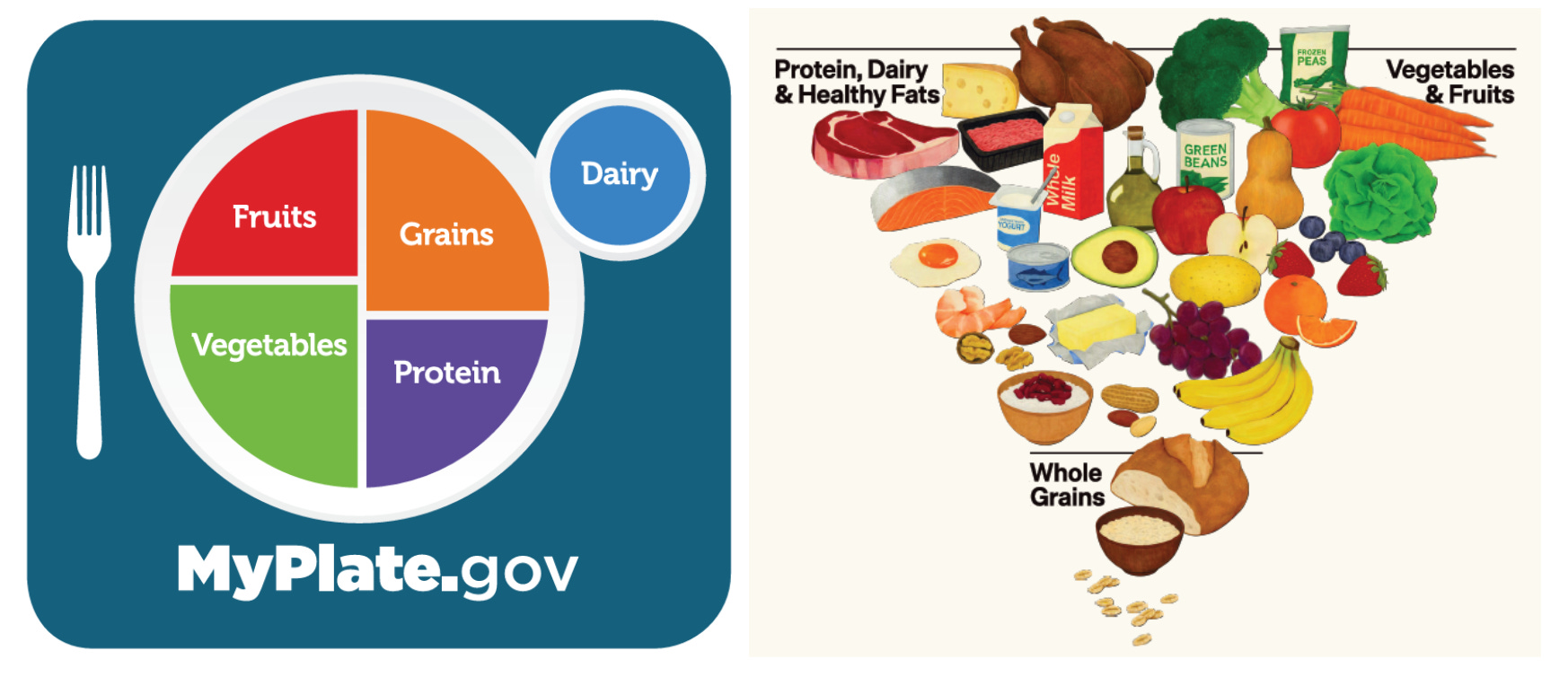 5. Introduction of a new graphic. The DGA replaces MyPlate with an inverted food pyramid. Protein, dairy, fats, vegetables, and fruits appear at the top, while whole grains are given less emphasis.