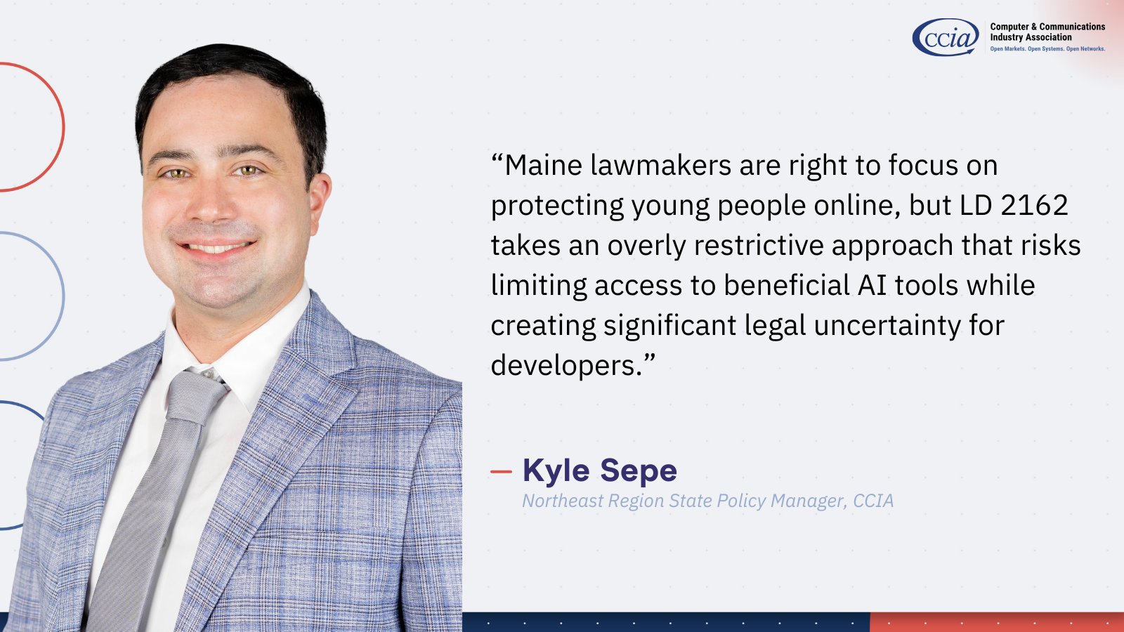 “Maine lawmakers are right to focus on protecting young people online, but LD 2162 takes an overly restrictive approach that risks limiting access to beneficial AI tools while creating significant legal uncertainty for developers. Effective AI policy should be grounded in technical realities and focused on clear, workable standards that address real risks without discouraging innovation.”