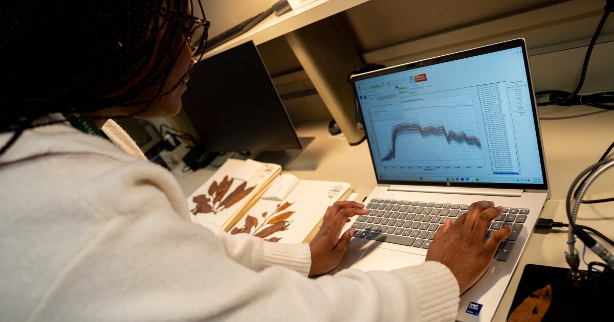 The Missouri Botanical Garden Herbarium operates like a library, containing pressed plants from across the globe. On a recent afternoon, hyperspectral scanning assistant Naeemah Anderson focused a specialized light on a tree leaf collected in Peru in 1991.