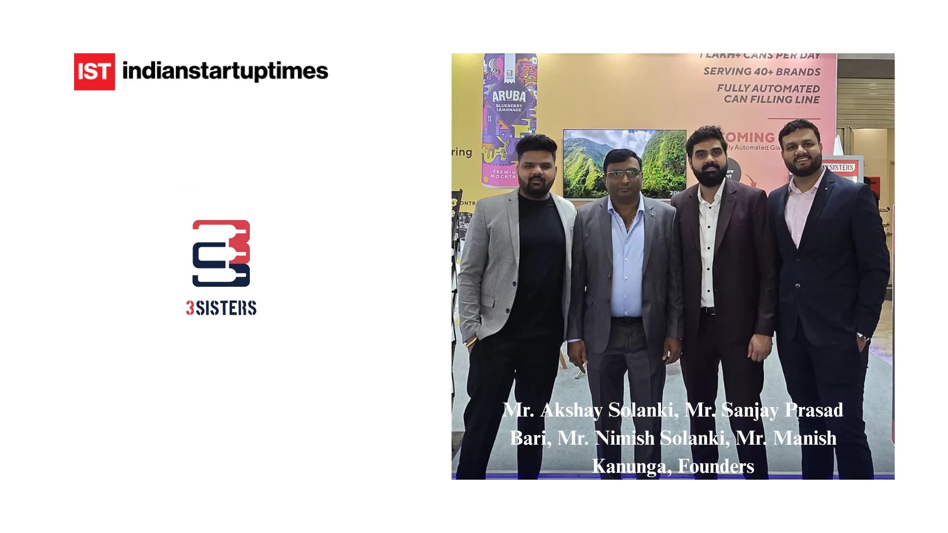 3 Sisters Drinks is co-founded by Akshay Solanki, Nimish Solanki, Manish Kanunga, and Sanjay Prasad Bari.