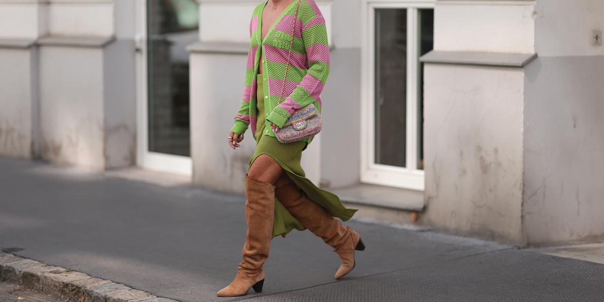 - Description: A classic going-out top layered with a balloon-sleeve dress and paired with thigh-high boots.