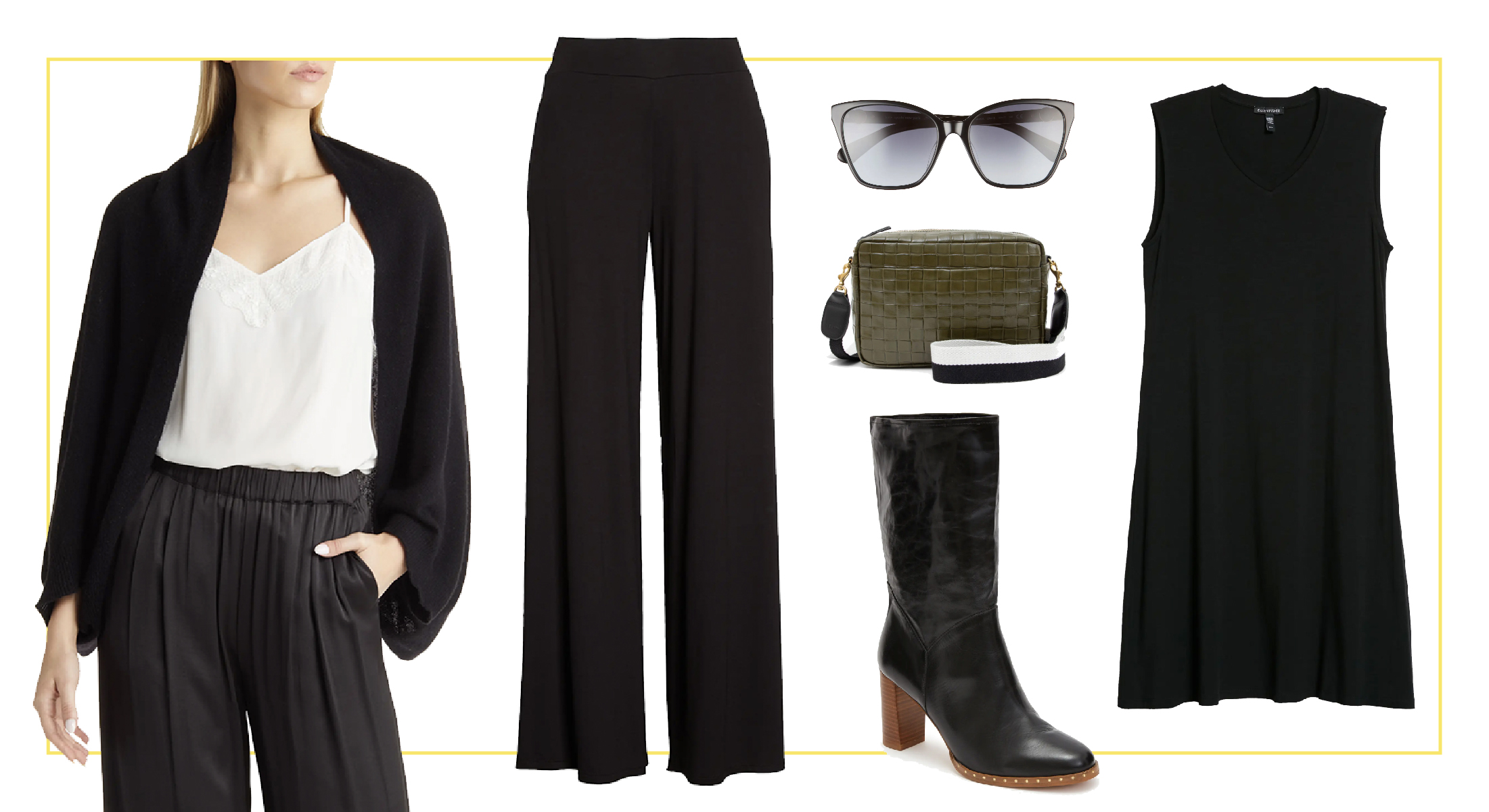 1. Night Out: A drapey Eileen Fisher top paired with edgy items like a belt bag and stylish boots for a night out.